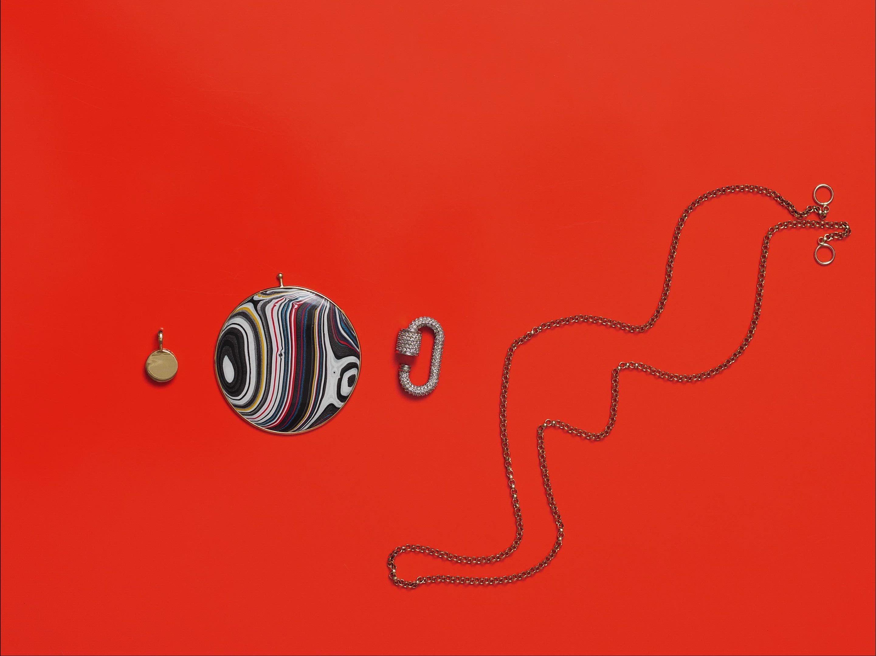 The Fordite Collection by Marla Aaron features a stunning array of locks, charms, and discs crafted from Fordite, a unique material formed from layers of automotive paint. Highlights include the Curb Bracelet with a Fordite Lock, the Trundle Lock Ring with a Fordite clasp, and the Mini Disc Earrings, all offering a vibrant mix of colors and history. Each piece is one-of-a-kind, capturing the spirit of innovation and craftsmanship. This collection celebrates individuality, with each Fordite piece telling its own story. Whether you're adding a charm to a bracelet or selecting a statement piece like the Fordite lock, there’s a bold sense of creativity behind every design. Discover other unique designs in Marla's eclectic collections, like the collection or Rolling Spheres series or the playful Trundle collection. Each offers endless ways to mix, match, and personalize your jewelry. Add your own creative touch with pieces from the Chain collection, allowing you to create a look that’s distinctly yours.