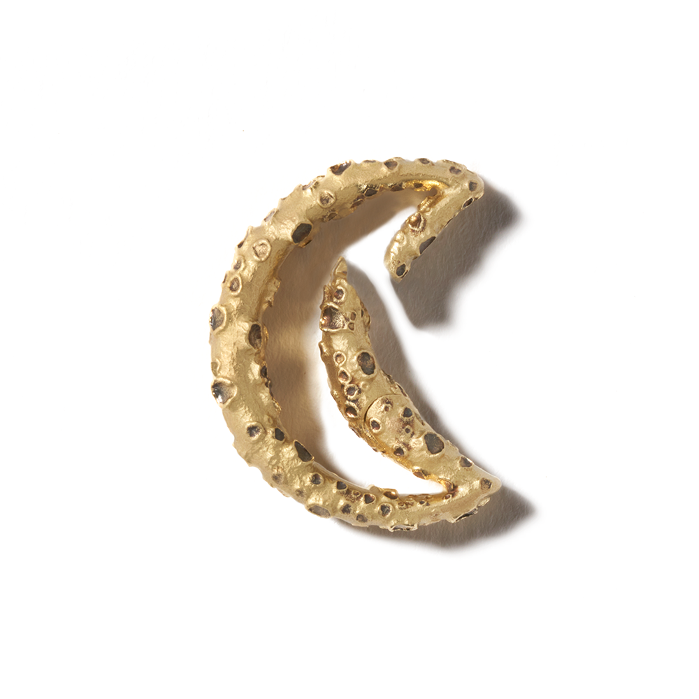 Marla took actual imagery of the moon's surface with all its uneven crater-y, gritty goodness to create this textured version of our very popular Moonlock. You will notice that the intricate surface has been highlighted ever so softly with some blackening so that they really feel like…well, that you’re on the moon. Like the other Moonlocks in the series, this style features a lever mechanism that opens and closes in a way that is beautiful and strong.