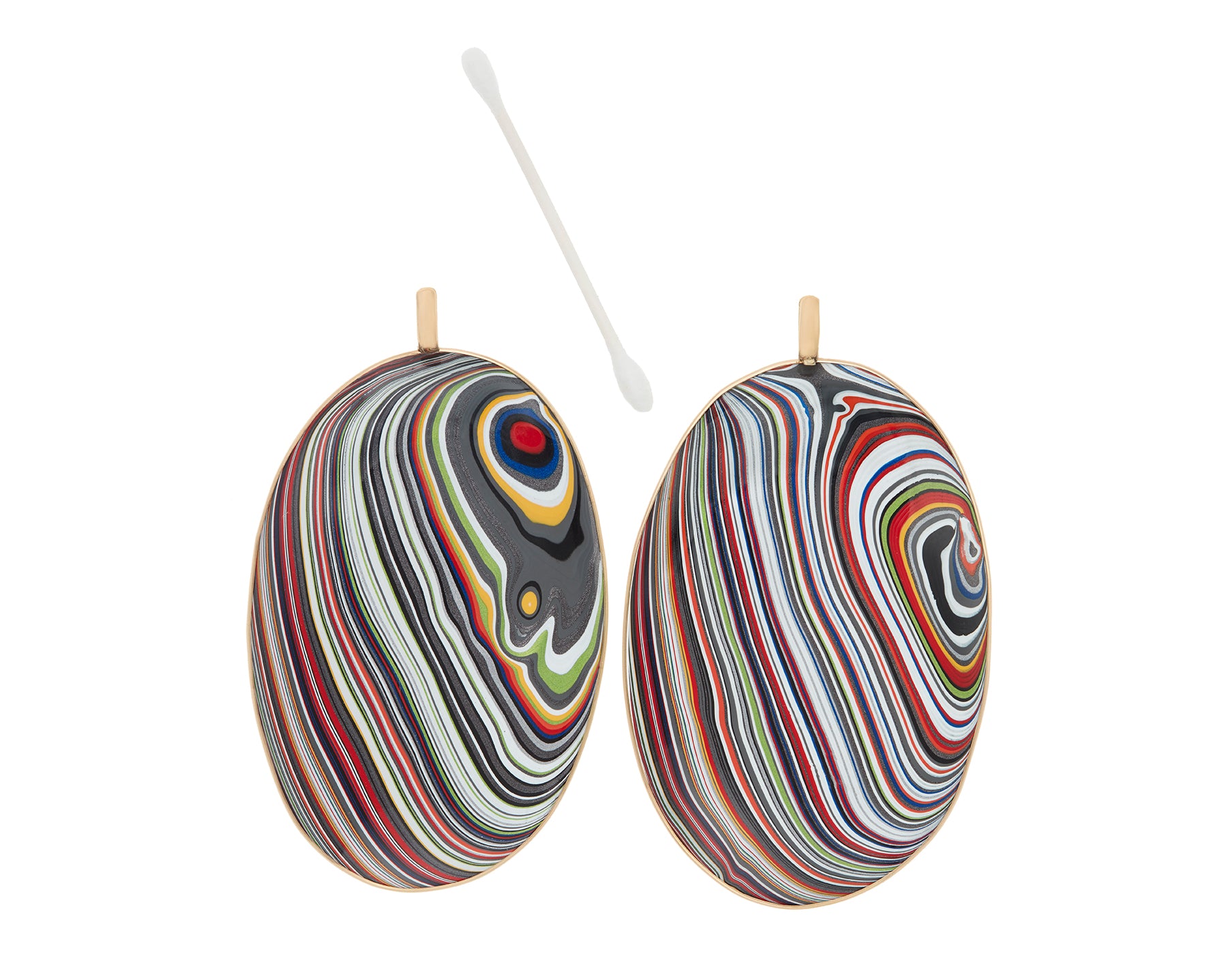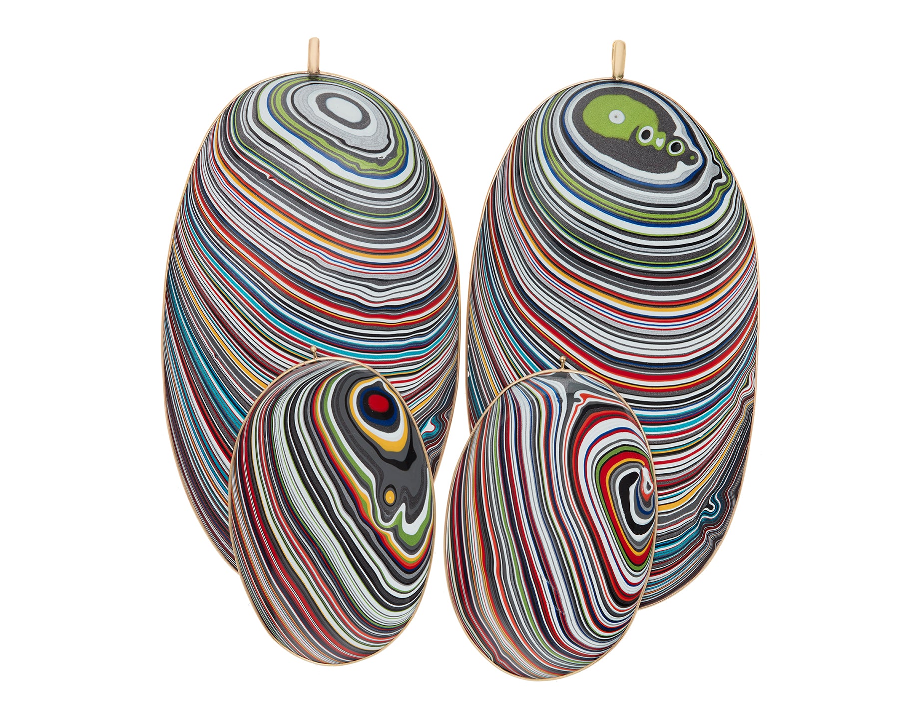 For the show, we took our work with Fordite and we blew it up into gargantuan discs that could be worn as earrings. If you own our earrings then you know how light and versatile they are. All Fordite pieces are sold in limited quantities as the material of this quality and age is extremely limited.