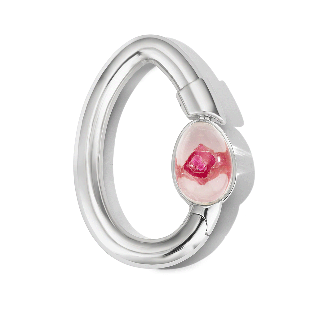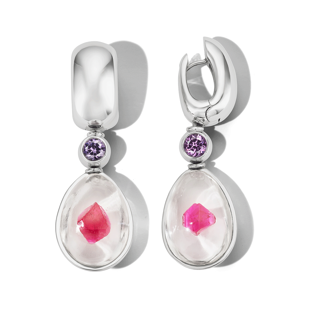 So they sat for a couple of years. I can’t explain where ideas come from so don’t ask but the fully formed idea that these stones needed to be encased in egg shaped crystals and perform as a Lock and become a parure with matching earrings just occurred to me. I reached out to the incredible stone cutter Michael Peuster who agreed to take a shot at it and he spent the time to make it happen and we know it wasn’t easy. Michael is going to be very surprised I think to finally see what we have done with his work…. I chose platinum because I love the way it offset the spinels.