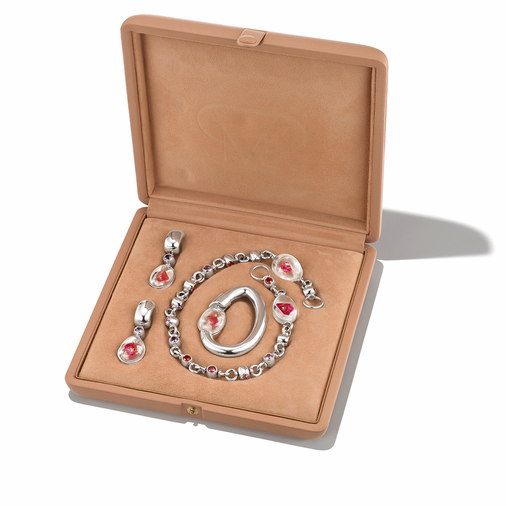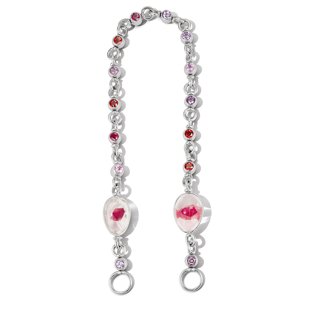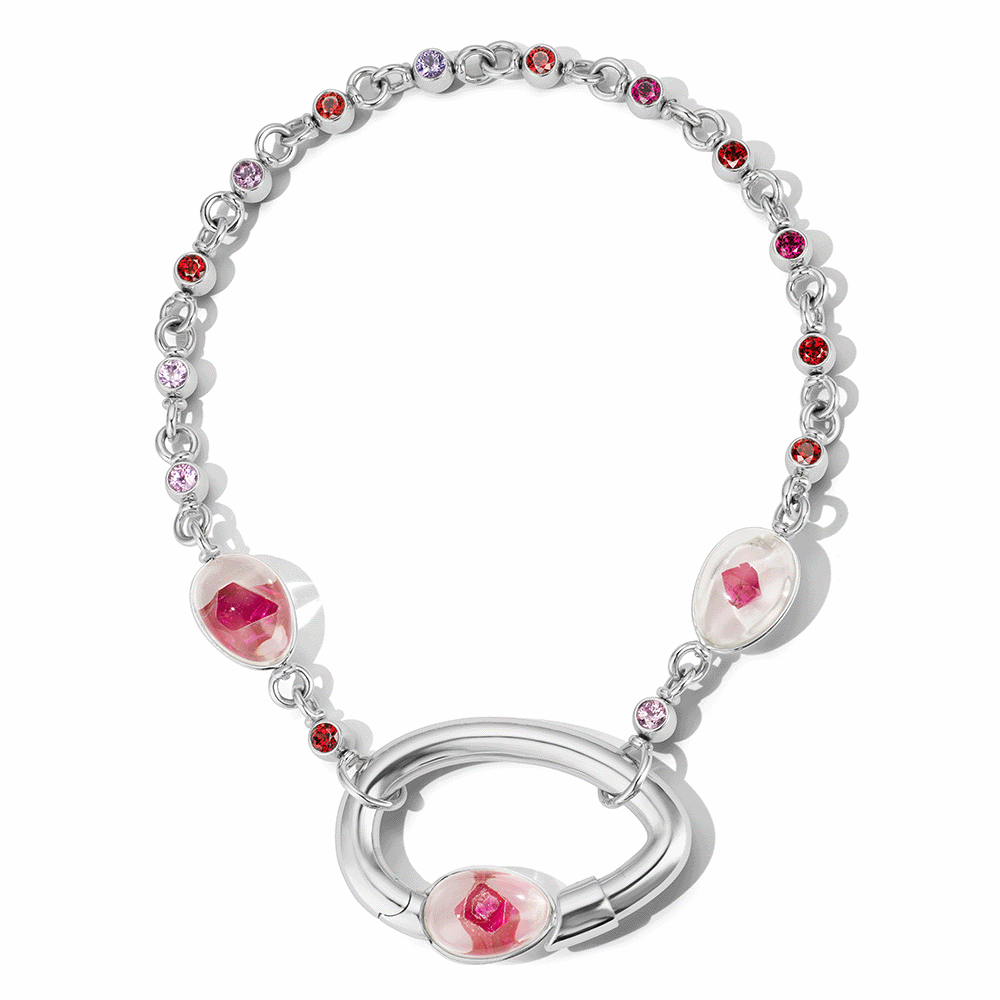 The chain is made of interlocking platinum “cans” with more spinels imbedded on either side. They spin. So they look different from every angle. It’s a parure which simply means it’s a set that is meant to be worn together but of course my hope is that you will wear all the pieces in many ways.