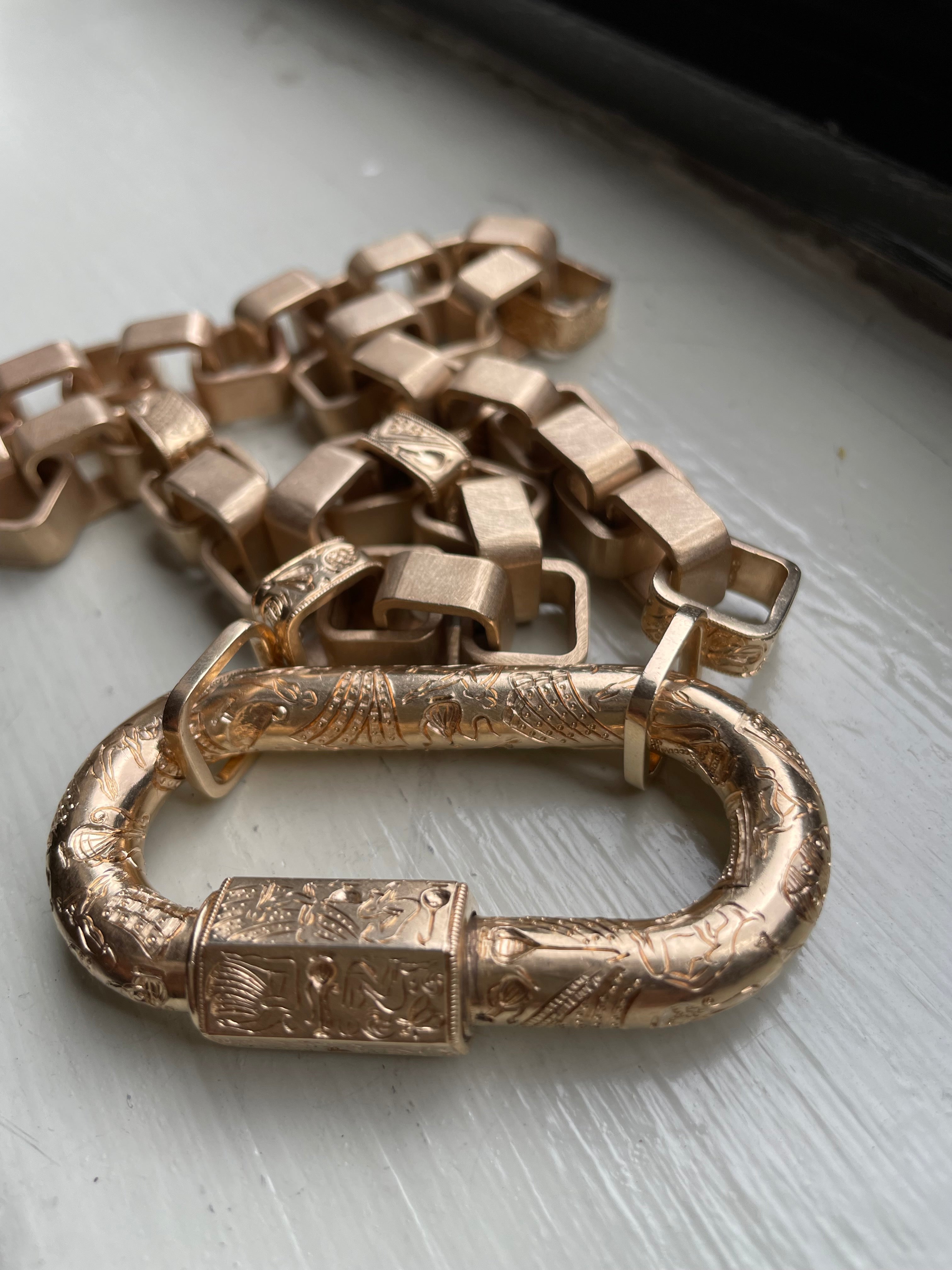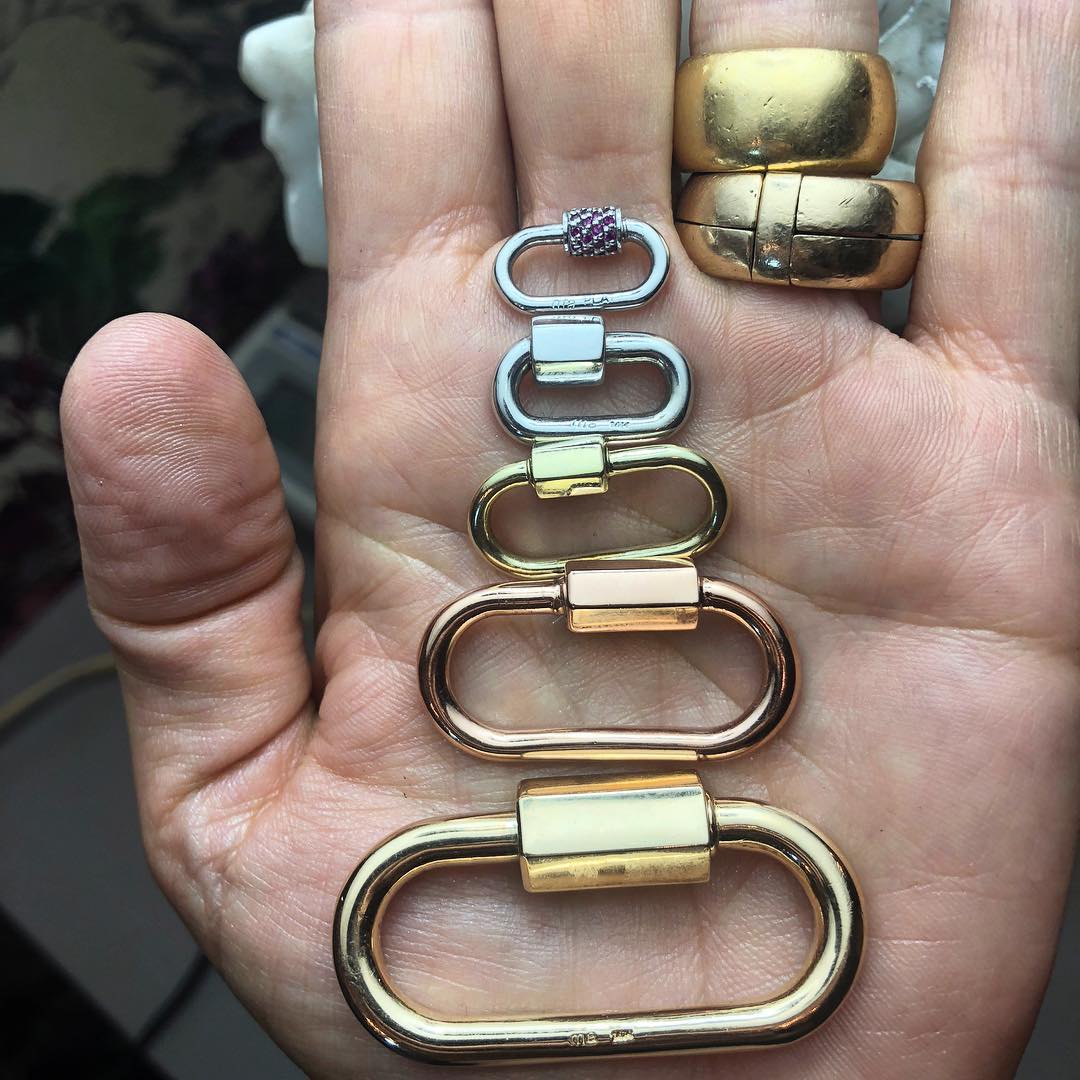 The locks were the original concept for the entire collection. Once Marla realized that she could morph the shape of a hardware store carabiner in a myriad of ways, the collection became a reality. People often ask her which one is the one to own and she honestly can't say. They are all solid and strong and crafted by hand and can be worn in infinite ways.