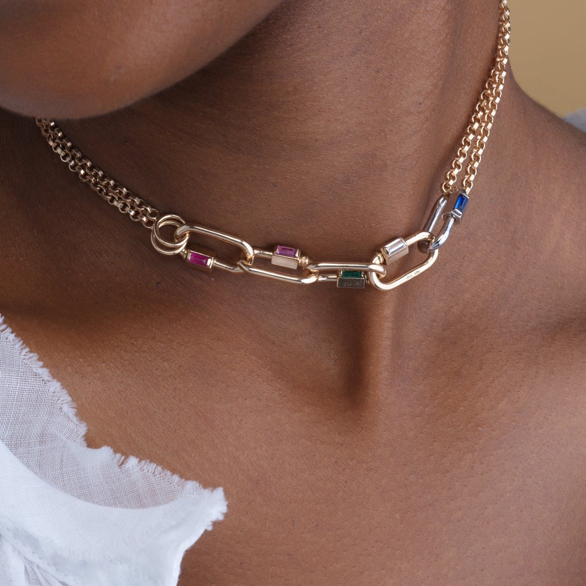 It comes in many variations—all of the golds: yellow, rose, and white—each one holding a single baguette: diamond, sapphire, ruby, emerald, or rhodolite.
