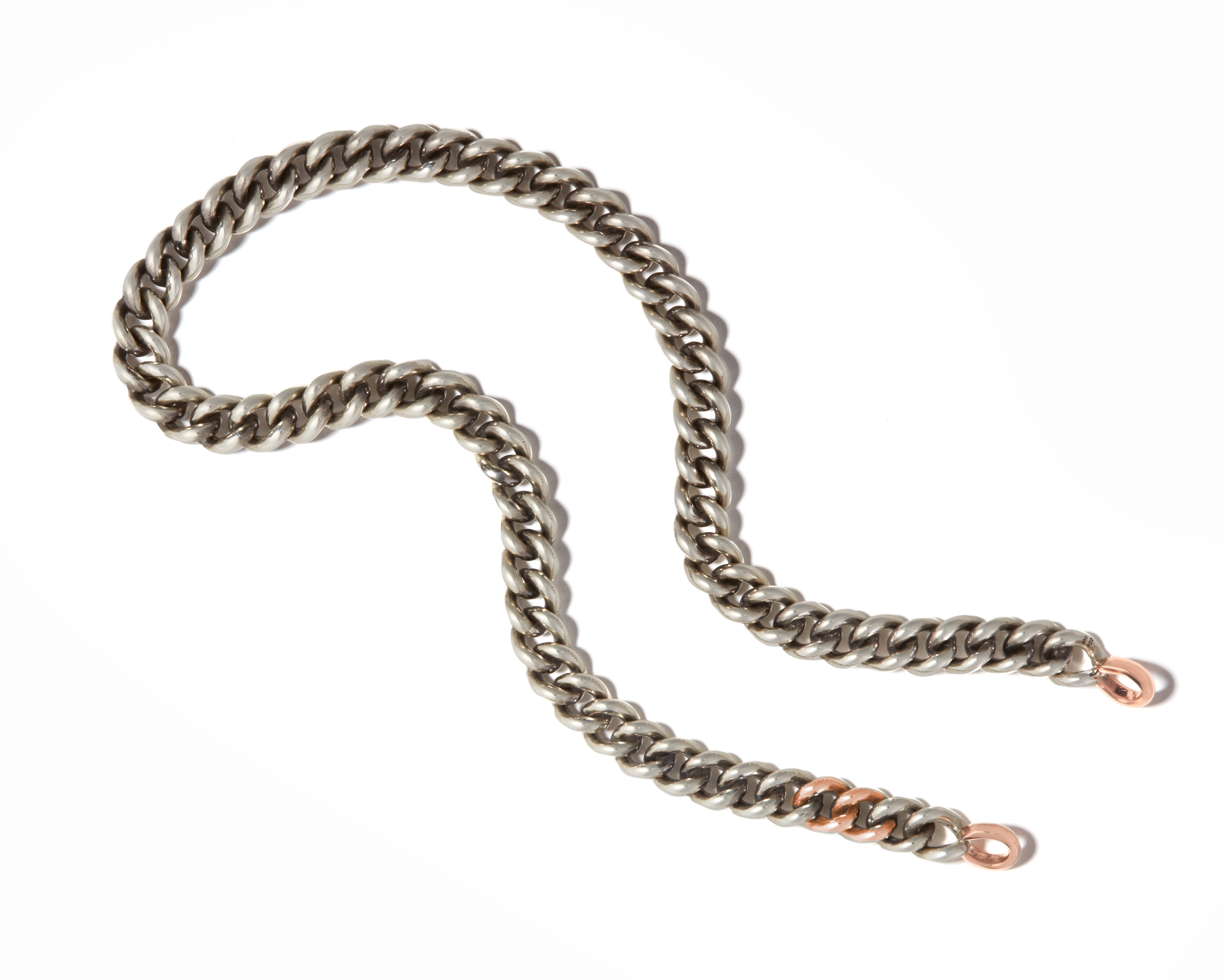 The “petite” sibling chain to the Mega Curb — as solid and beautiful as the Mega but a bit smaller— this version is half gold and half silver to dramatic effect.