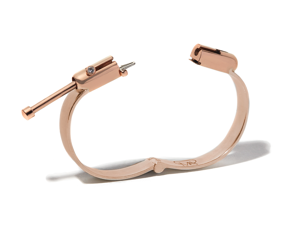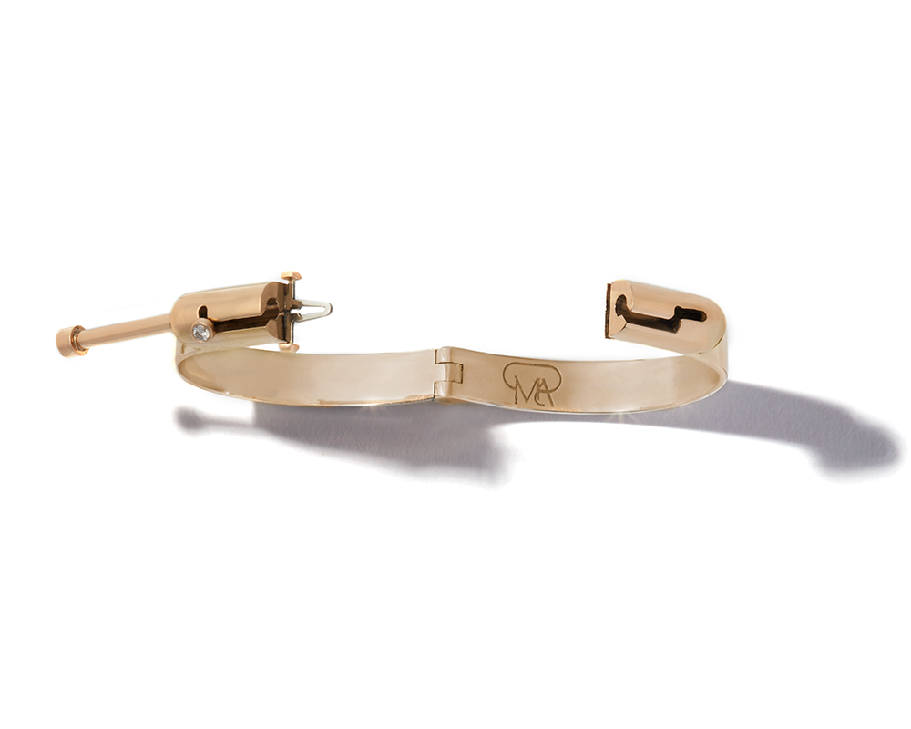 We wanted to build a bracelet shaped like a wrist—flat on top, rounded at the sides. But fiddle-worthy. I’d been wanting to incorporate a barrel style lock from a door and an exposed hinge into a piece somehow—they’d been on my desk for a while—one of each—waiting for a home. When we started modeling the prototype the shape of the domed closure reminded me of the 1934 Burlington Zephyr 9900 train—train that rain from Chicago to Denver. The function is the story of this gold clasp bracelet, as is the case with our pieces.