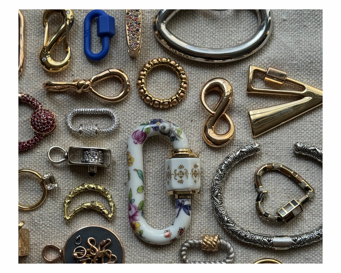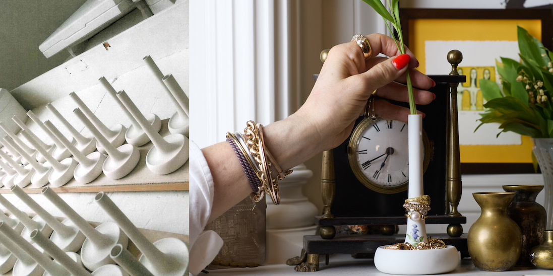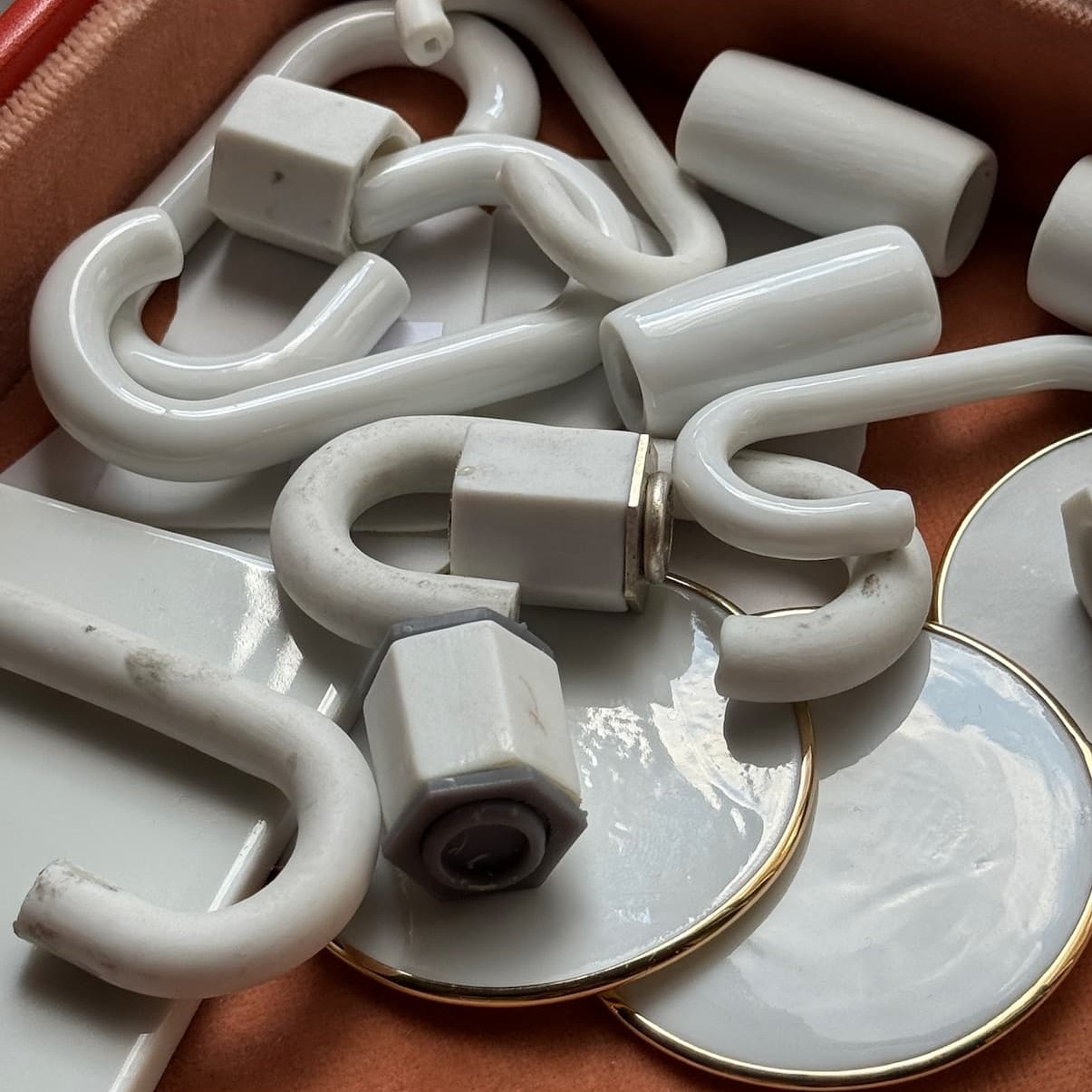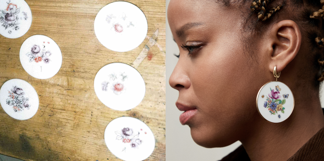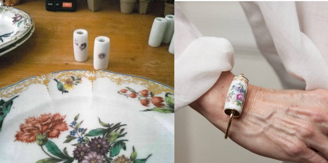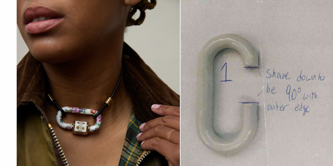 And that's when I figured it out—I wanted to turn 4 pieces from our collection—a Trundle Lock Bracelet, a Lock, Earring Discs, and a Depository-to be made in porcelain, painted with the iconic Cumberland pattern and finished in gold. A merging of our workshop and theirs to turn this pattern into jewelry because it was so beautiful I wanted to wear it and thought you would too. Like telling stories of travel gone wrong, telling stories about developing ideas into working objects is probably just as wretched because it is filled with failures and mistakes and yet you keep going. There were moments where I think we all thought we wouldn't get here, but here we are. This collection is a celebration of ridiculous ideas brought to life by incredible craftspeople on 2 continents, speaking different languages and working in different materials. Here is the final piece next to a peek at the process: