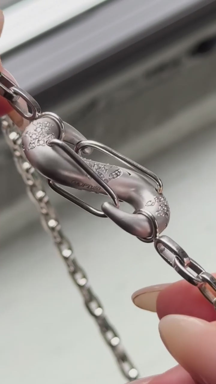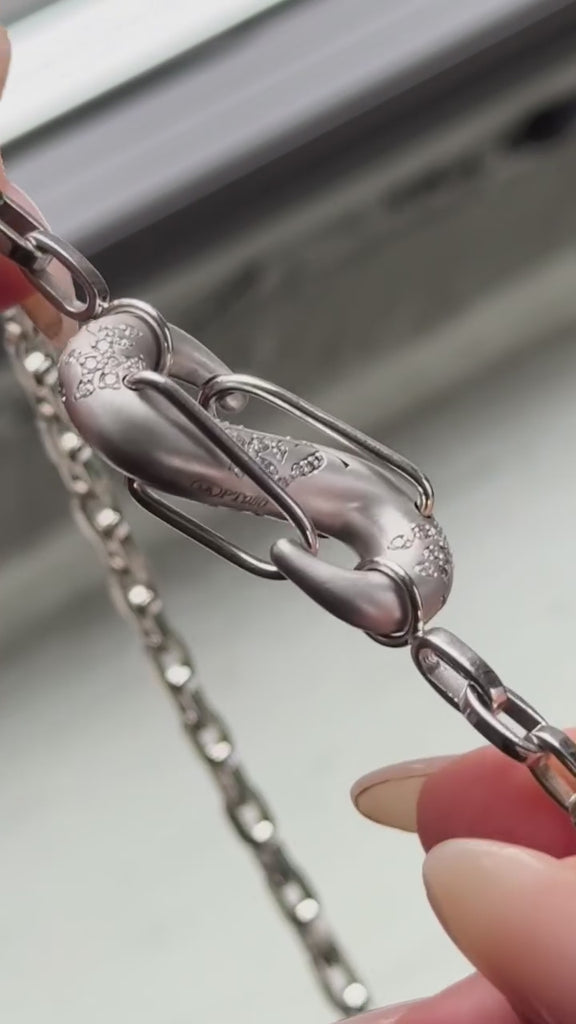 Our PushmiPullyu Lock is the highest expression of what our jewelry is about. It’s maximalist. It’s functional—so functional we named it after the PushmiPullyu creature from Doctor Dolittle, with its two heads. It’s feminine (because it’s so functional!). It’s weighty. It harkens back to the past. It will do everything you need it to do. This is it: Floral PushmiPullyu in platinum with diamonds.