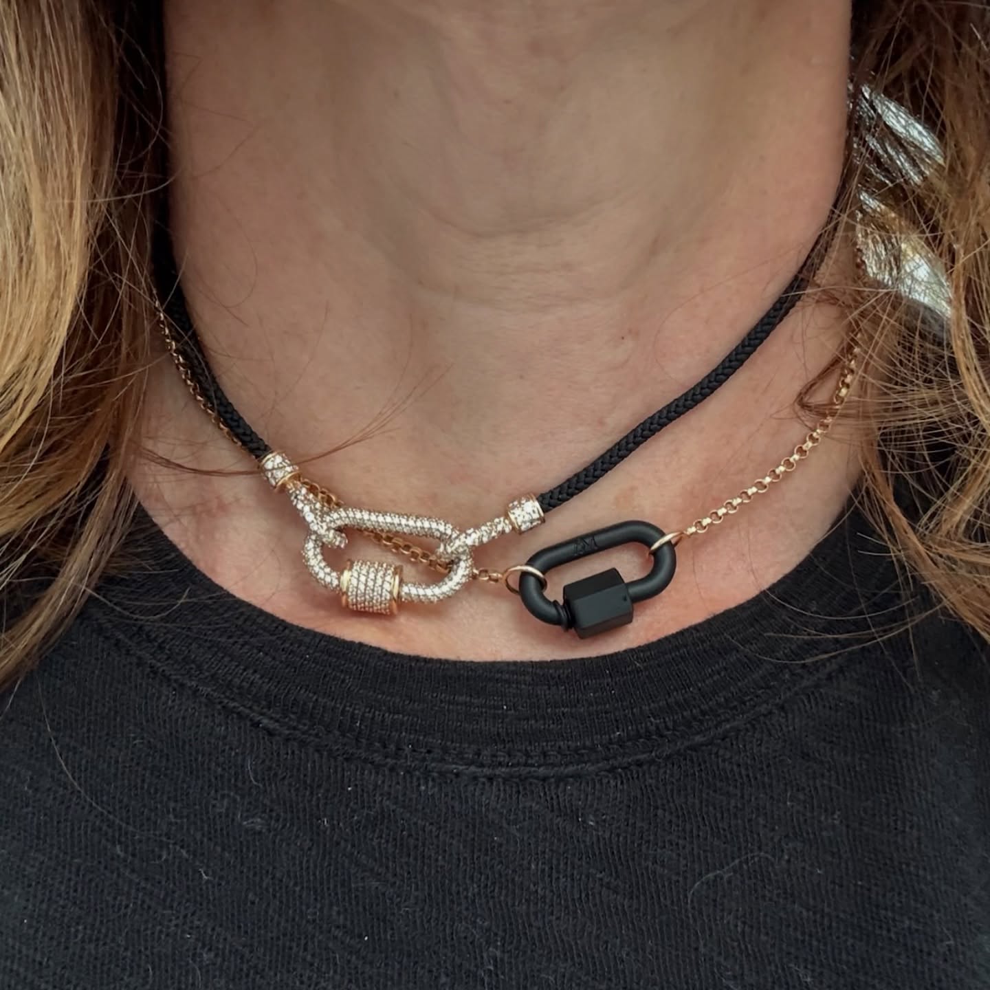 The String  Project is finished in 14k yellow gold or rose gold and pave diamonds. The string is made with Dyneema, the world’s strongest fiber, a fiber that is 15x stronger than steel but light enough to float in water. It’s made in the USA just for us.