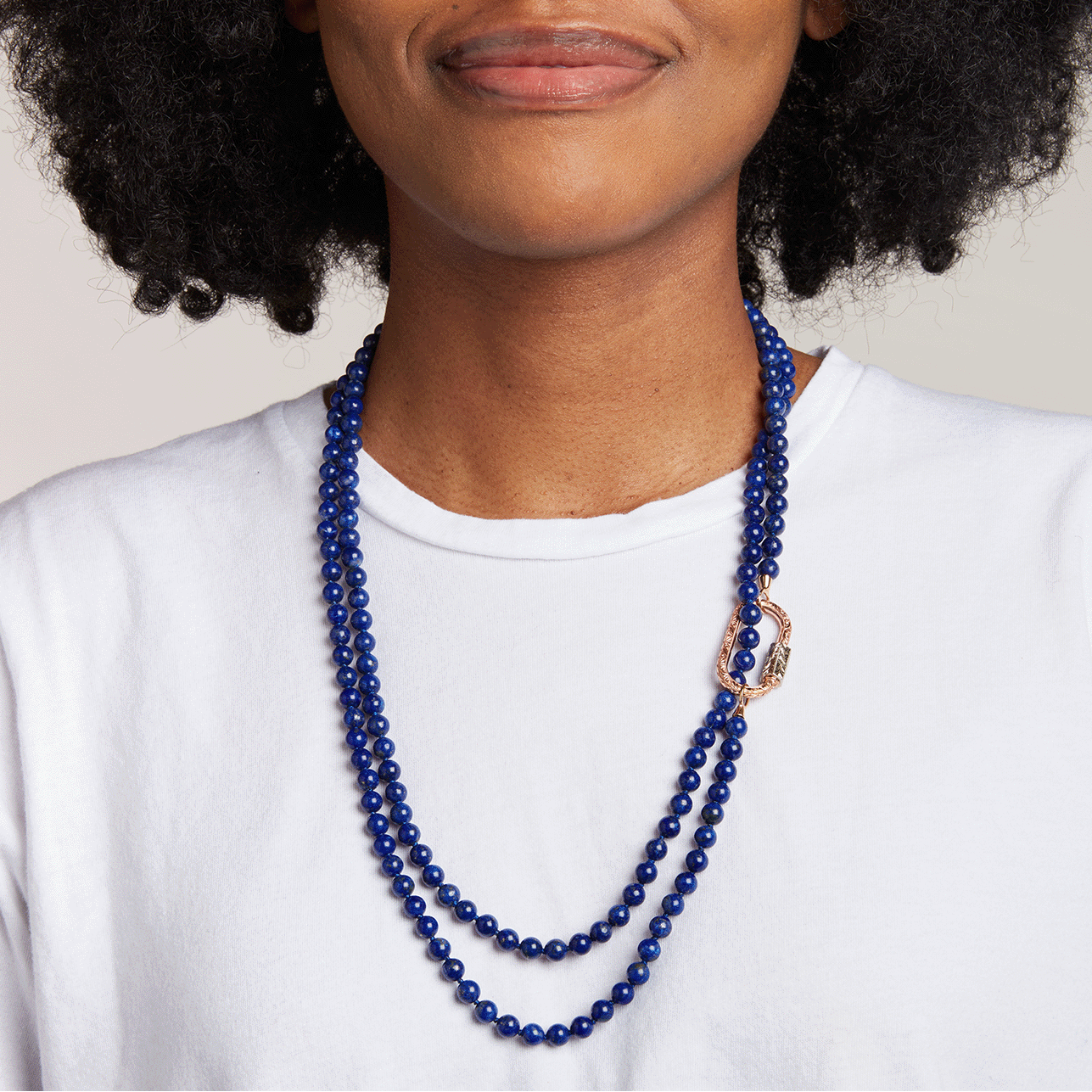 All the strands are 48″ and are wearable as bracelets or as necklaces at various lengths by doubling and tripling. They are designed to be worn with Marla Aaron Locks. They can be worn in multiples or with our chains or simply on their own.