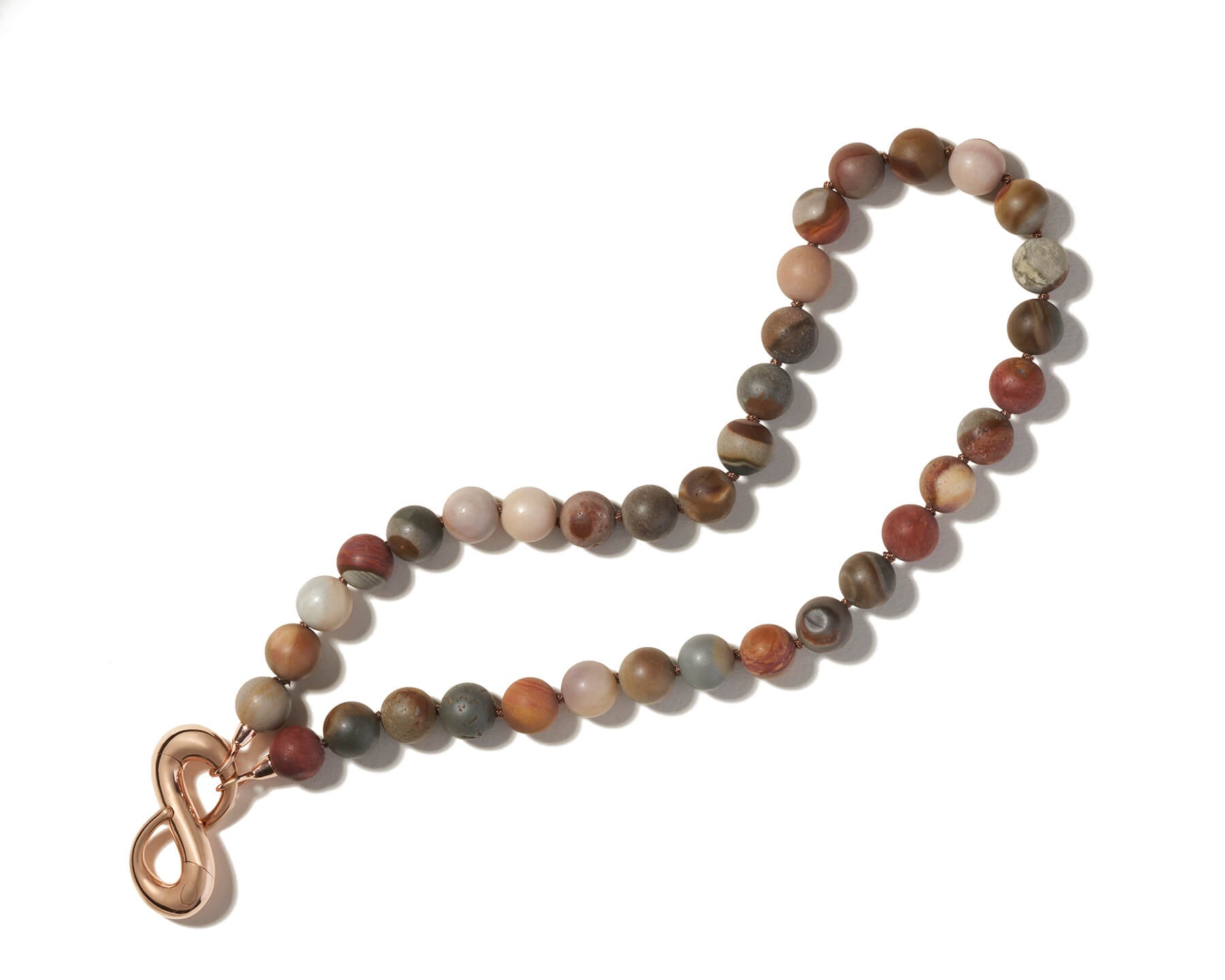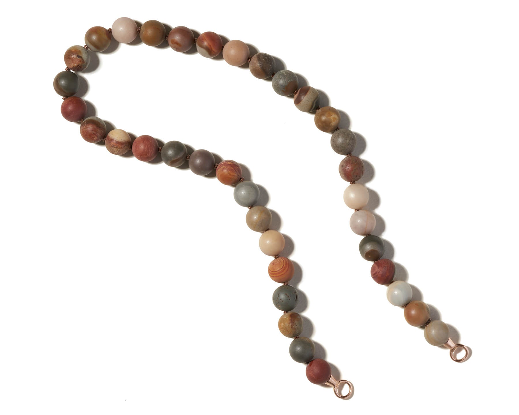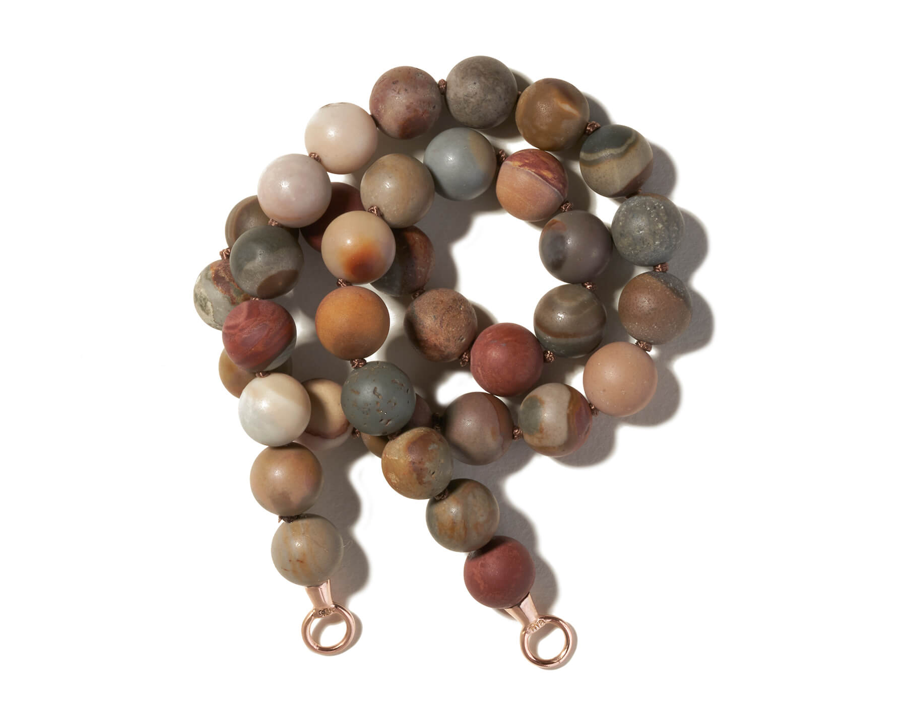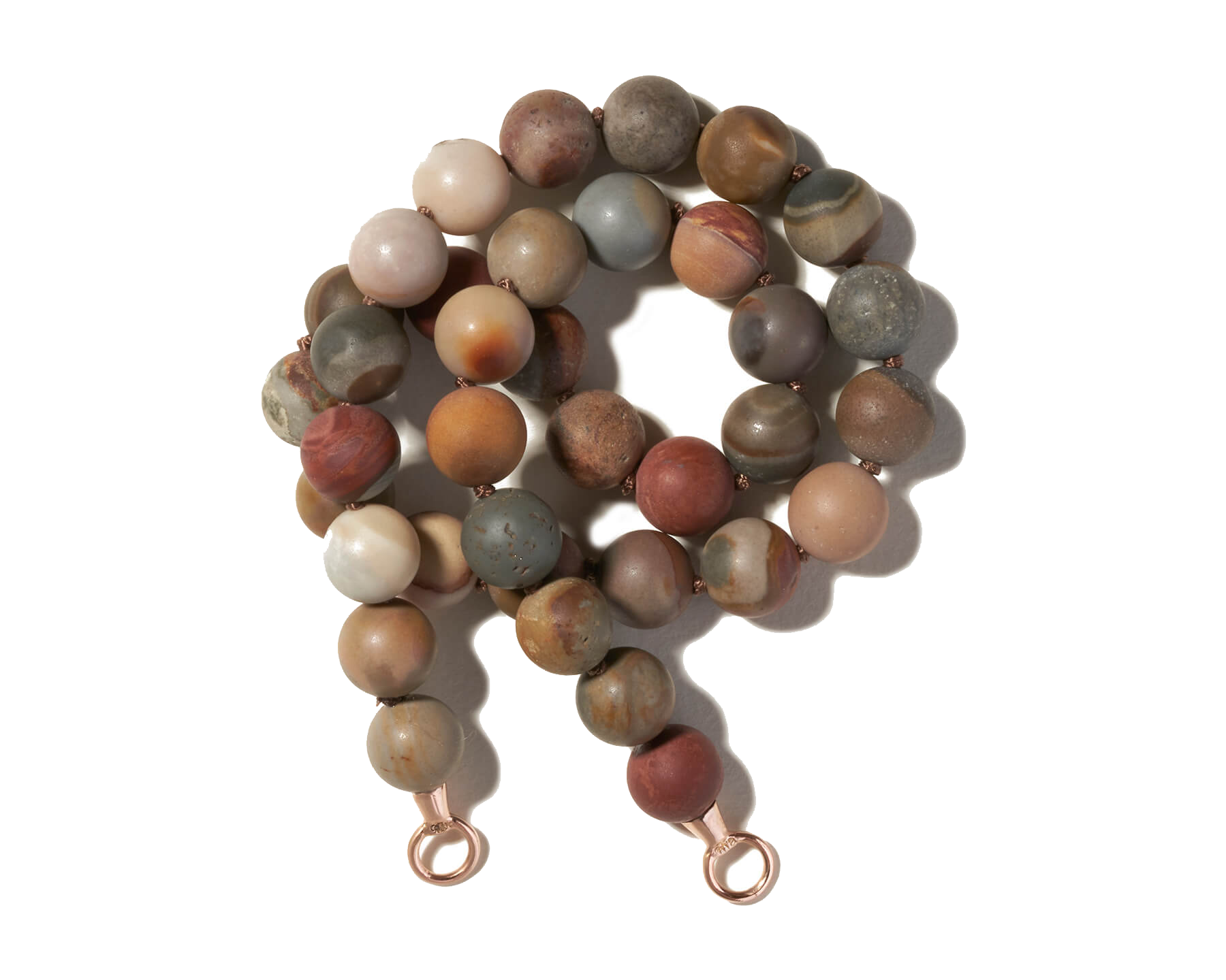 A strand of imperial jasper round beads measuring approximately 8mm wide and up to 24" long. Each bead is unique and a landscape in itself. Wear with Lock.