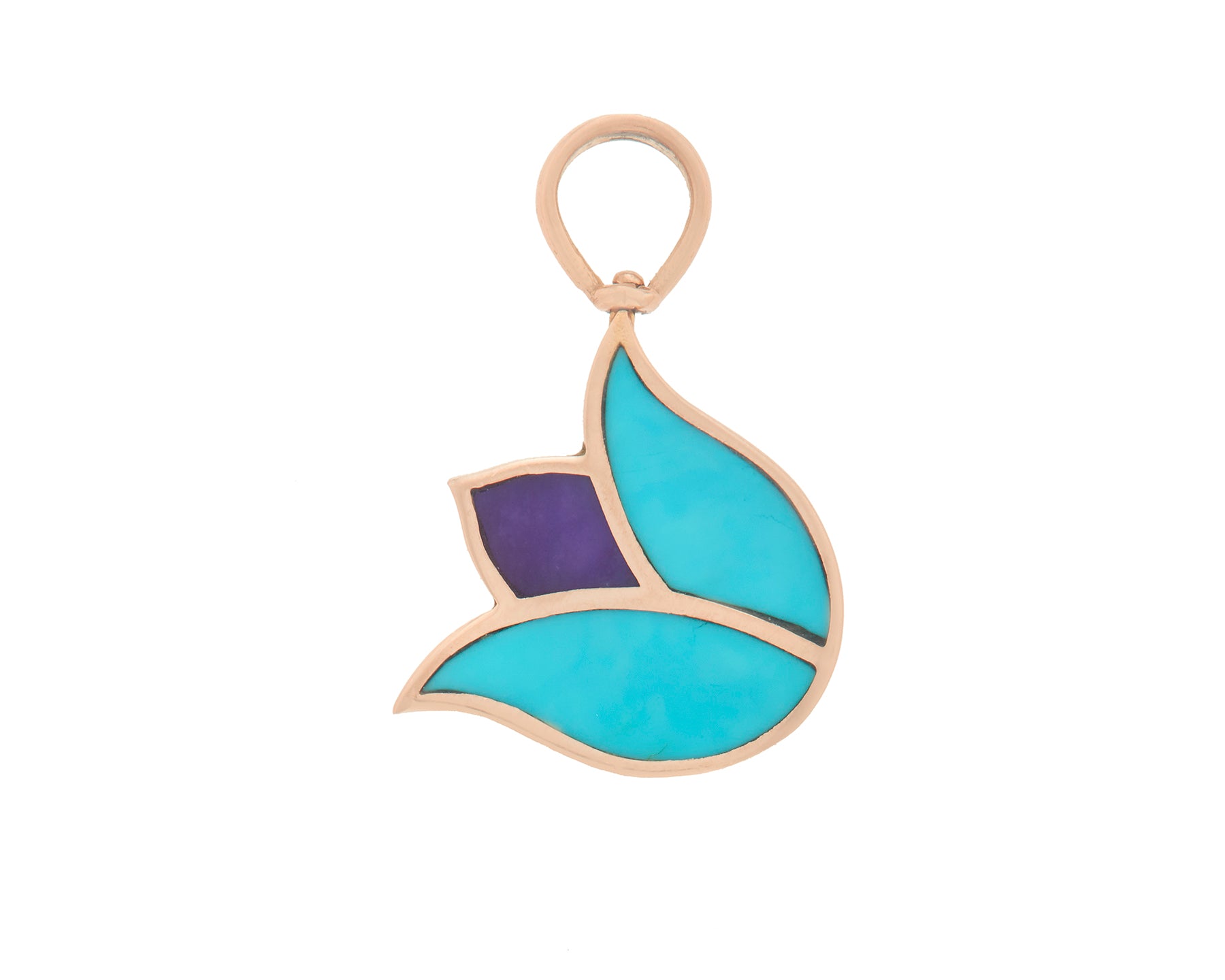 Part of our latest charm series, this charm is a a fanciful tulip in Sleeping Beauty Turquoise and Chariot. No two are exactly alike. It swivels to a back that is solid gold and perfect for engraving. Not botanically correct at all. Just pretty.