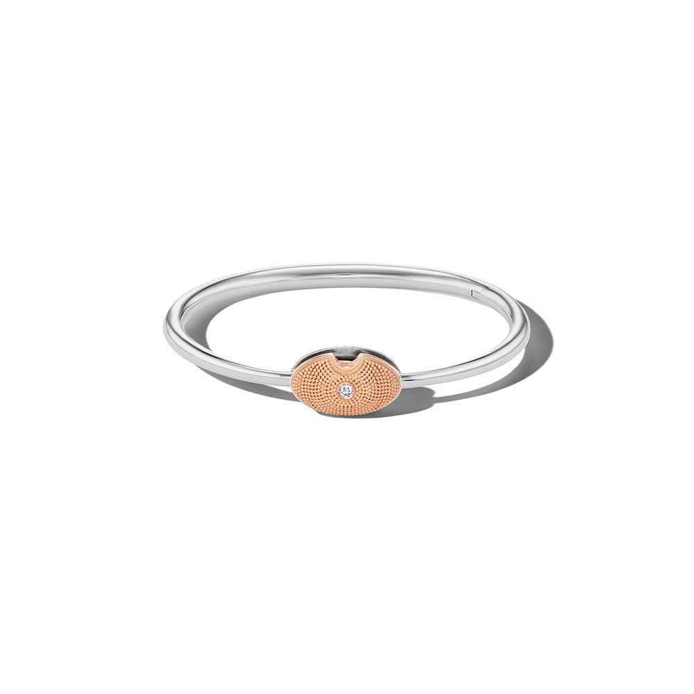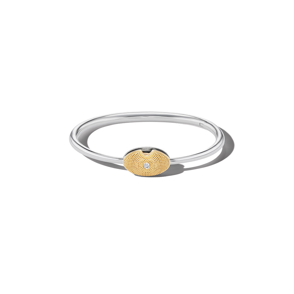 We have turned the Musgrave mechanism into a bracelet with two ovals that spin in opposite directions to release a side. Perfect on its own or stacked. We're bringing this to you in a milligrain design in silver and gold version with a diamond.