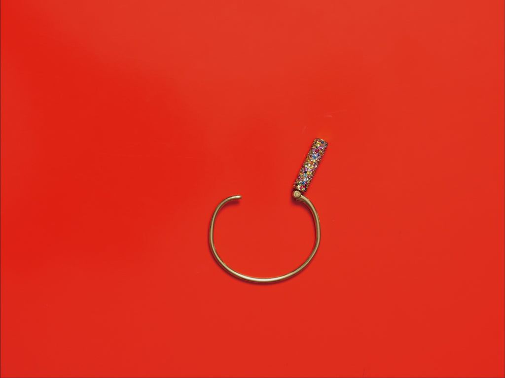 In 18K gold and a cylinder of Fordite--the paint that accumulates on the floor of automotive.