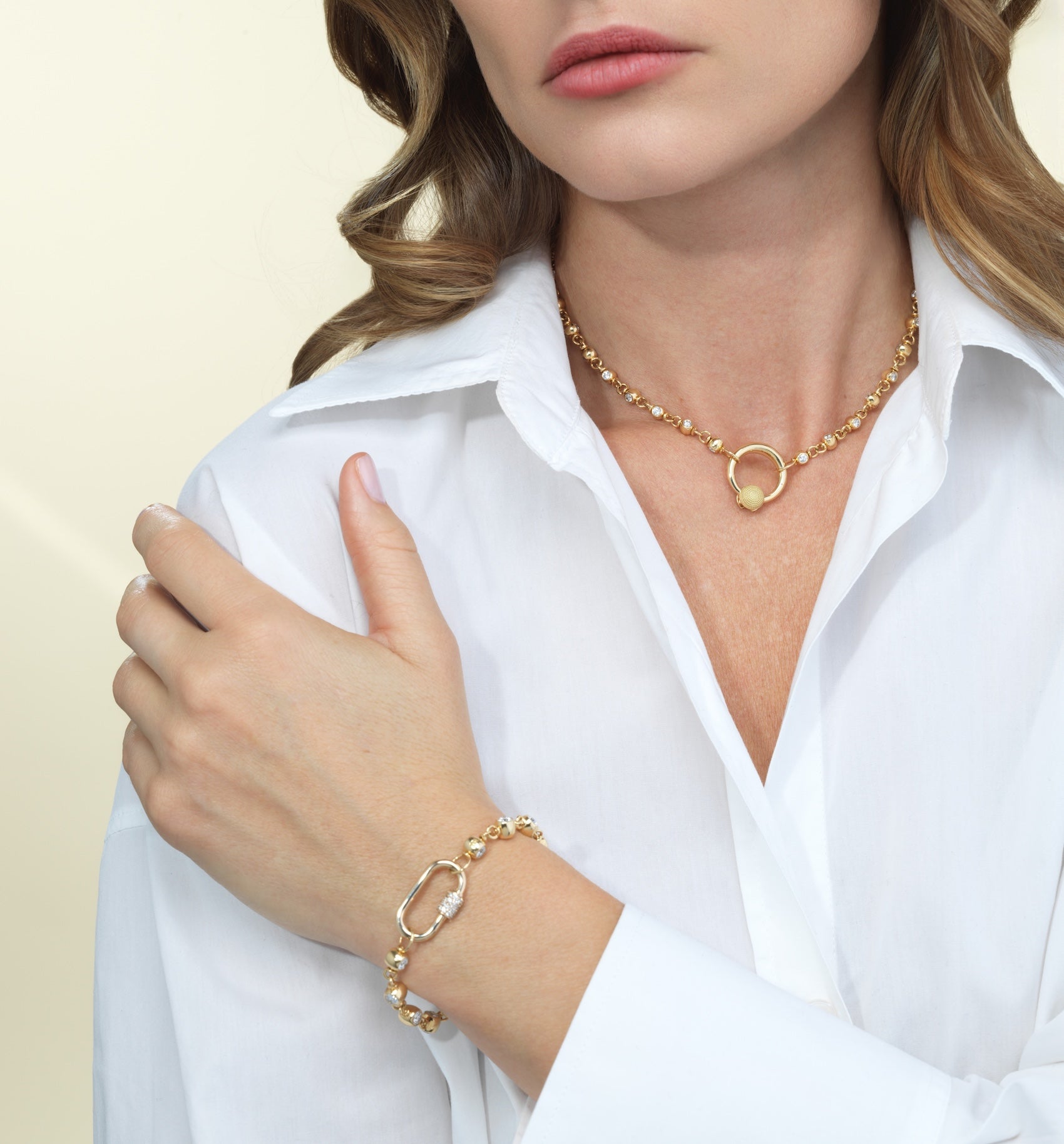 Let’s start off by saying what this is not. This is not a tennis bracelet. What it is, is a bracelet made of a series of spinning, swiveling little "cans" capped on on both sides with diamonds. Each can moves independently, catching the light in interesting ways. It's a series of tiny little diamond mechanisms, each "rolling". You’ll notice that this chain does not come in “Lock” form and that is because it is meant for all our Locks. We particularly love it with the Musgrave series.