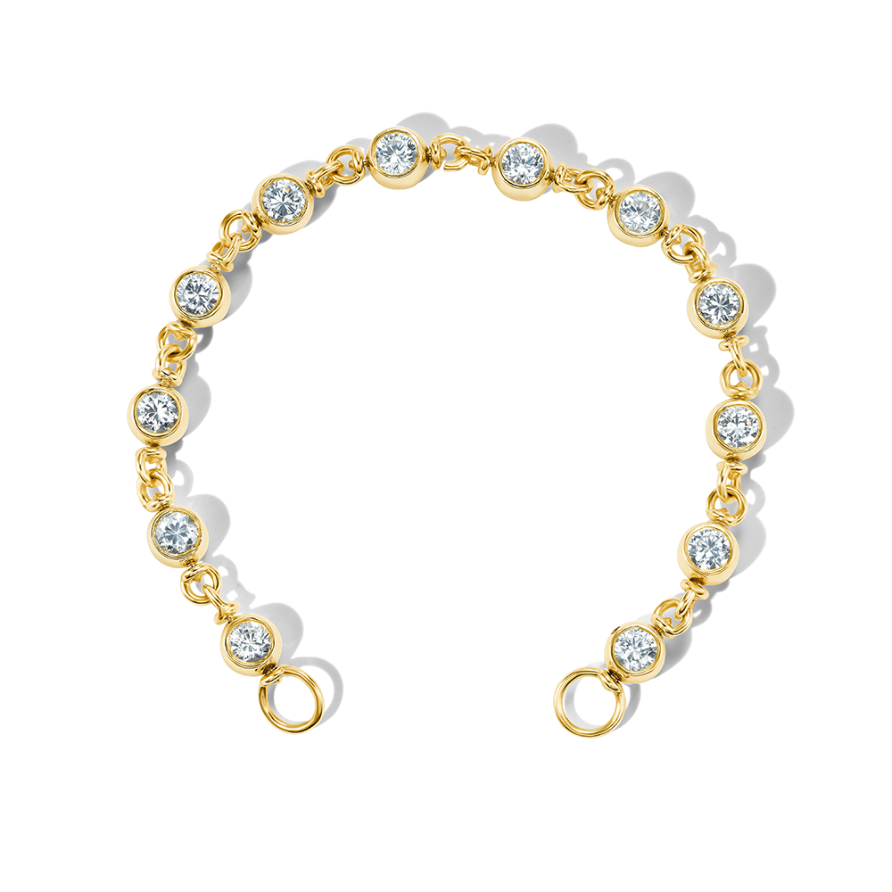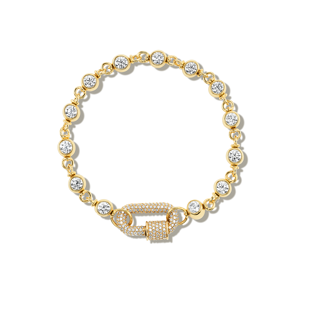 Let’s start off by saying what this is not. This is not a tennis bracelet. It’s bigger. Literally and figuratively. Made from a series of spinning, swiveling large "cans" capped on both sides with diamonds, that roll independently. You’ll notice that this chain does not come in “Lock” form and that is because it is meant for all our Locks. We particularly love it with the Musgrave series.