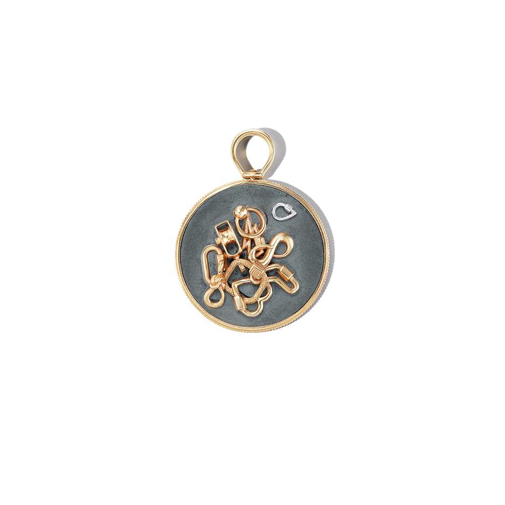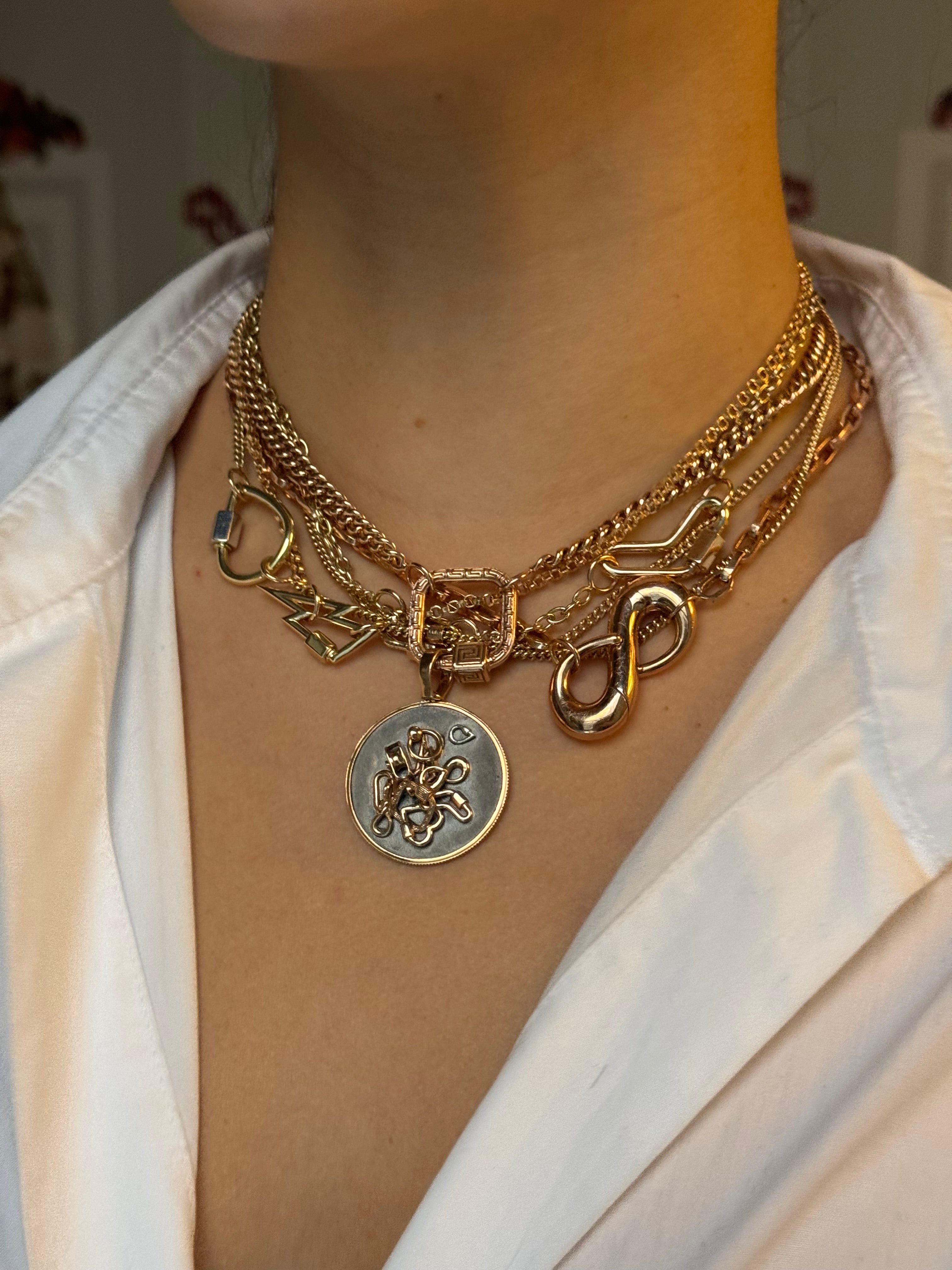 While all of our pieces are optimized for play, our charms are where we tend “goof around" the most. Sometimes they’re made from things Marla has collected over the years—available in very small quantities—and sometimes they’re like this: just a few of our most beloved Lock styles, stacked up in one delicious pile on one side of a swiveling medallion. The other side is perfect for engraving. There is no front or back—thanks to the swivel, also great for fiddling. This charm is oxidized and available in all silver (exclusively at our showroom in New York City and marlaaaron.com) or mixed metal (silver/yellow gold or silver/rose gold).