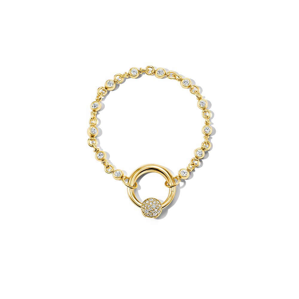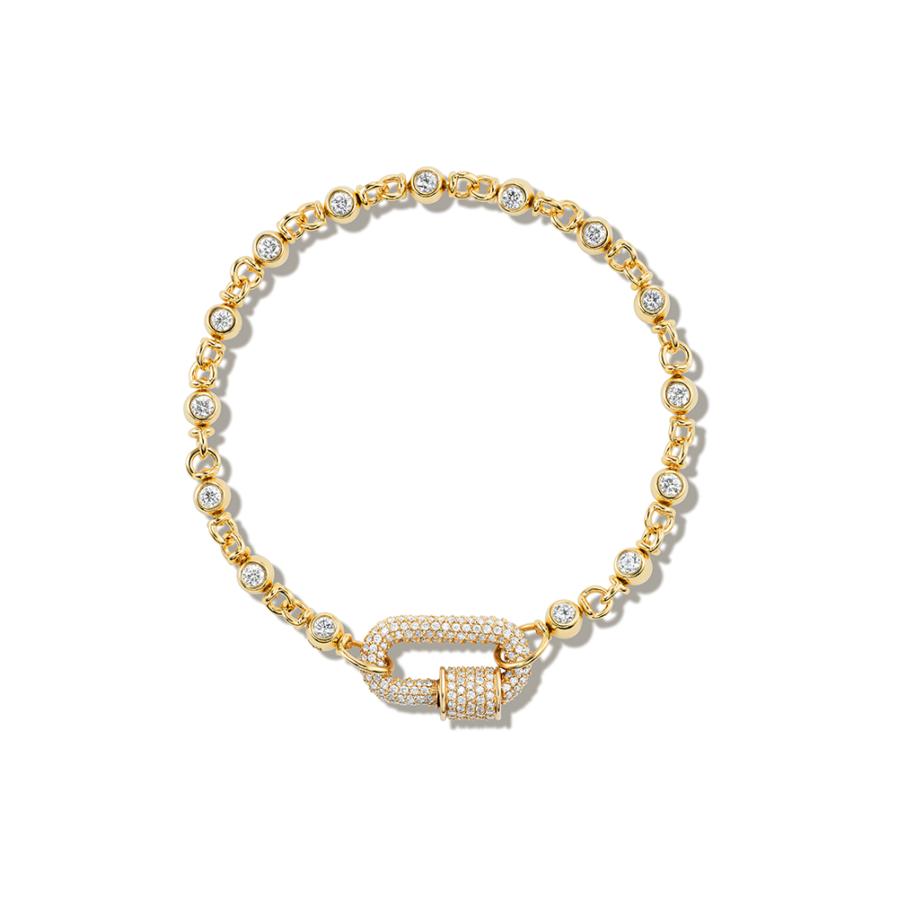 Let’s start off by saying what this is not. This is not a tennis bracelet. It’s bigger. Literally and figuratively. Made from a series of spinning, swiveling cans capped on on both sides with diamonds, you’ll notice that this chain does not come in “Lock” form and that is because it is meant for all our Locks, though we love it the most with the Musgrave.