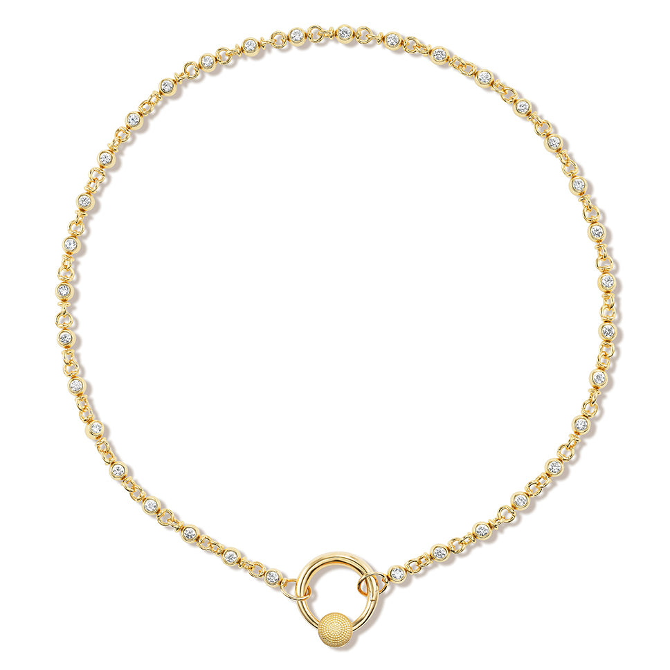 Let’s start off by saying what this is not. This is not a tennis bracelet. What it is, is a bracelet made of a series of spinning, swiveling little "cans" capped on on both sides with diamonds. Each can moves independently, catching the light in interesting ways. It's a series of tiny little diamond mechanisms, each "rolling". You’ll notice that this chain does not come in “Lock” form and that is because it is meant for all our Locks. We particularly love it with the Musgrave series.