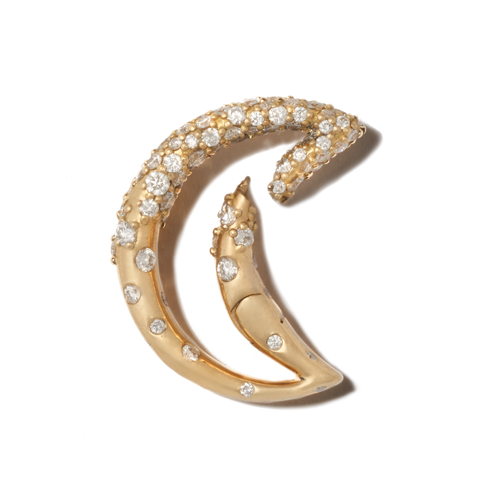 You wanted the Moonlock back but we had to make it better. And then we had to make it crazy with this diamond dipped version of our Moonlock in 18K. The piece has an elegant and highly functional lever mechanism that opens and closes. It is weighty in the way you would expect from our jewelry. And they are of course good at “braceleting”, “necklacing”, “charm-holding”, and everything else you will dream up as you play with them. Think of it as a moon covered in stars.