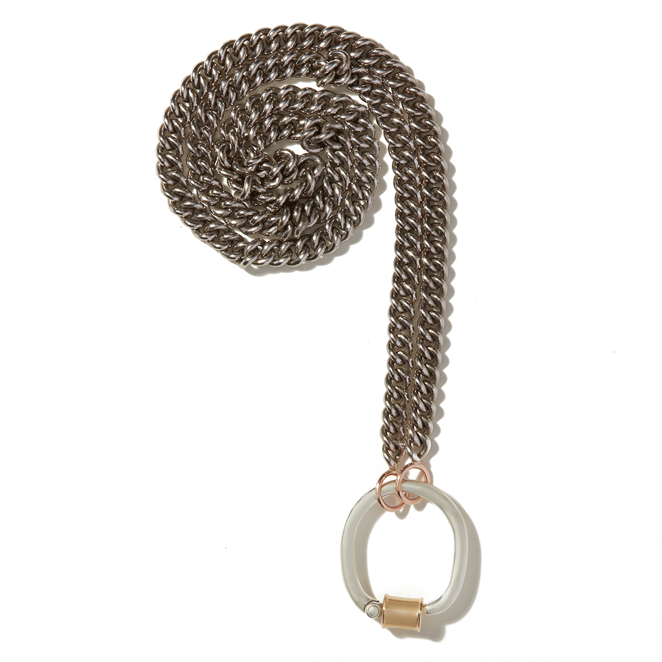 Curled up silver chain with trundle ring attached to it against white backdrop