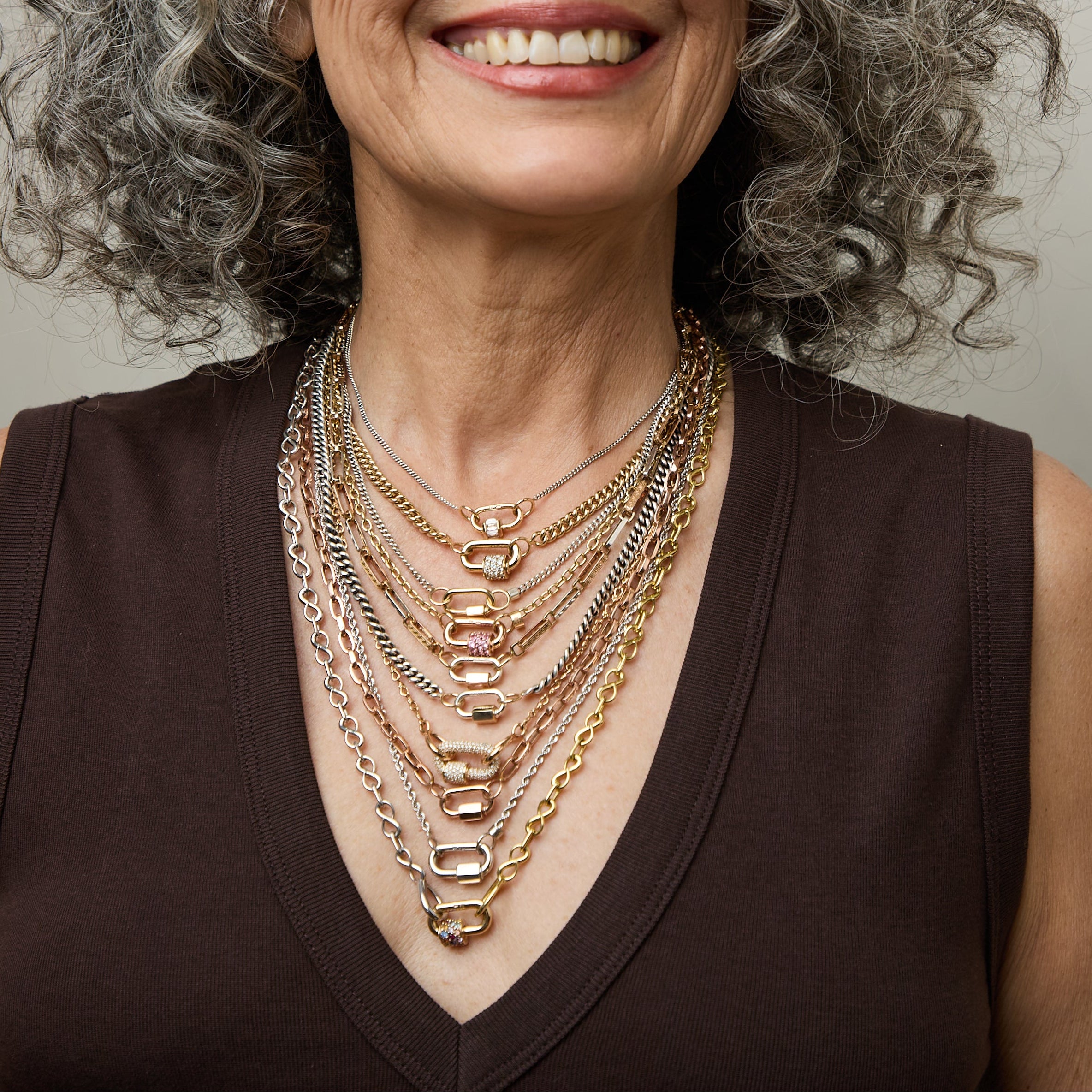“Stoned” is our naming convection for gemstone jewelry. So instead of “real gemstone jewelry” we make stoned jewelry. Our gemstone Locks are strong and resilient that make excellent charm holders—with our charms or yours, and while they work with all of our gold and silver chains, they also work with our gemstone strands . So that’s the stoned story..