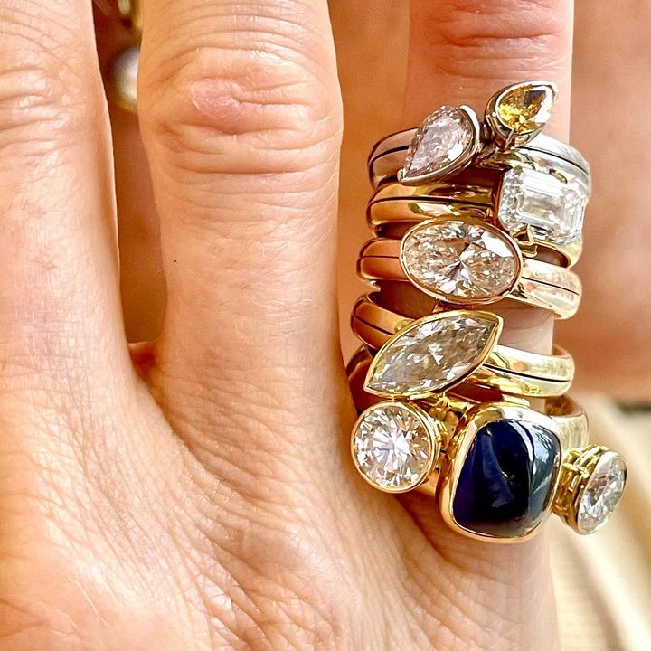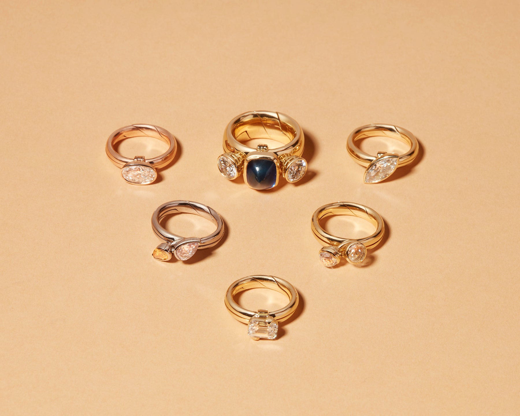 It begins with a collection of rings we make called the DiMe Series. Dime (pronounced “dee-meh”) means "tell me" in Spanish, but an intimate form of tell me. This collection is inspired by Gimmel Rings, a style that dates back to the 14th century and traditionally carried a small amount of words inside them. We have made many versions of our DiMe rings with many, many messages inside of them, but it wasn’t until Marla came across an evening bag with a jeweled closure that she realized our Dime ring had the potential for much more in the form of clasping a precious stone. And so, we made a new collection that brought this “aha” moment to life. And we called it DiMe Siempre. Siempre means forever.