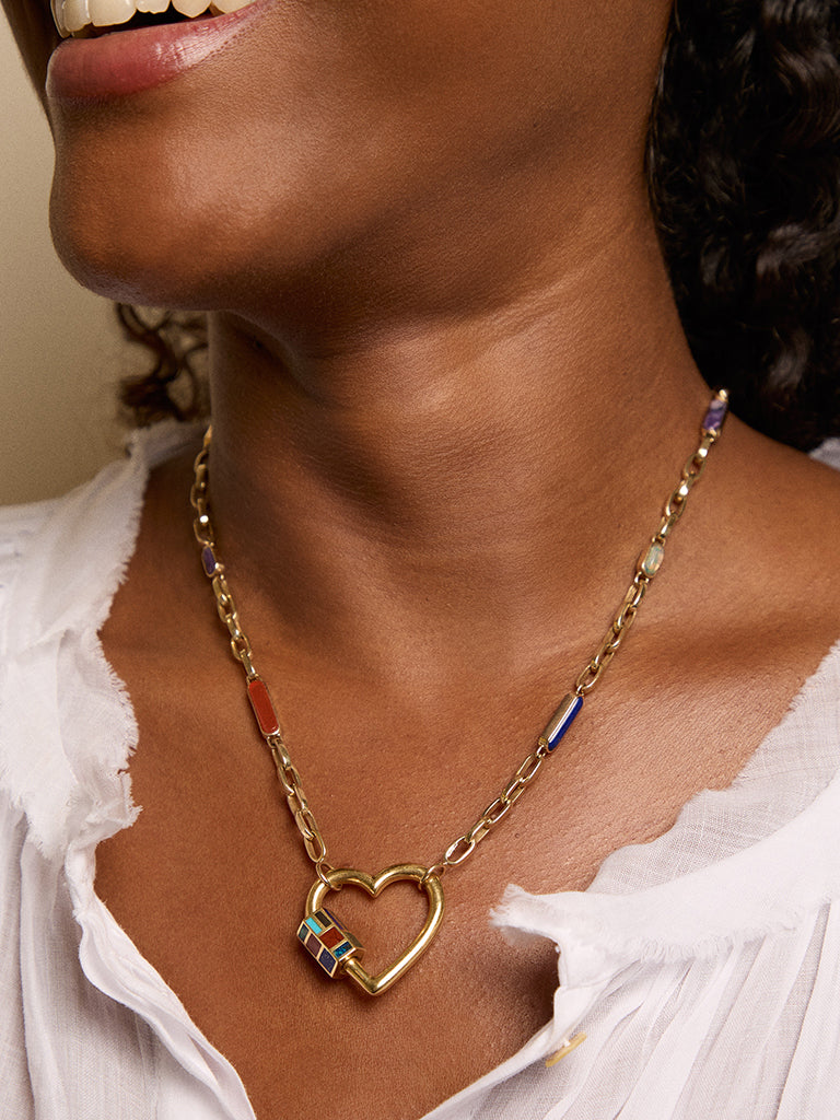 Inlay is one of our great loves, and this no pattern pattern chain always feels like that "just right" unexpected piece you want to wear, with the Inlay stones visible from every angle. We love it with all of our Locks, but if you're really going for it, pairing it with the Total Inlay Lock is the way to go.