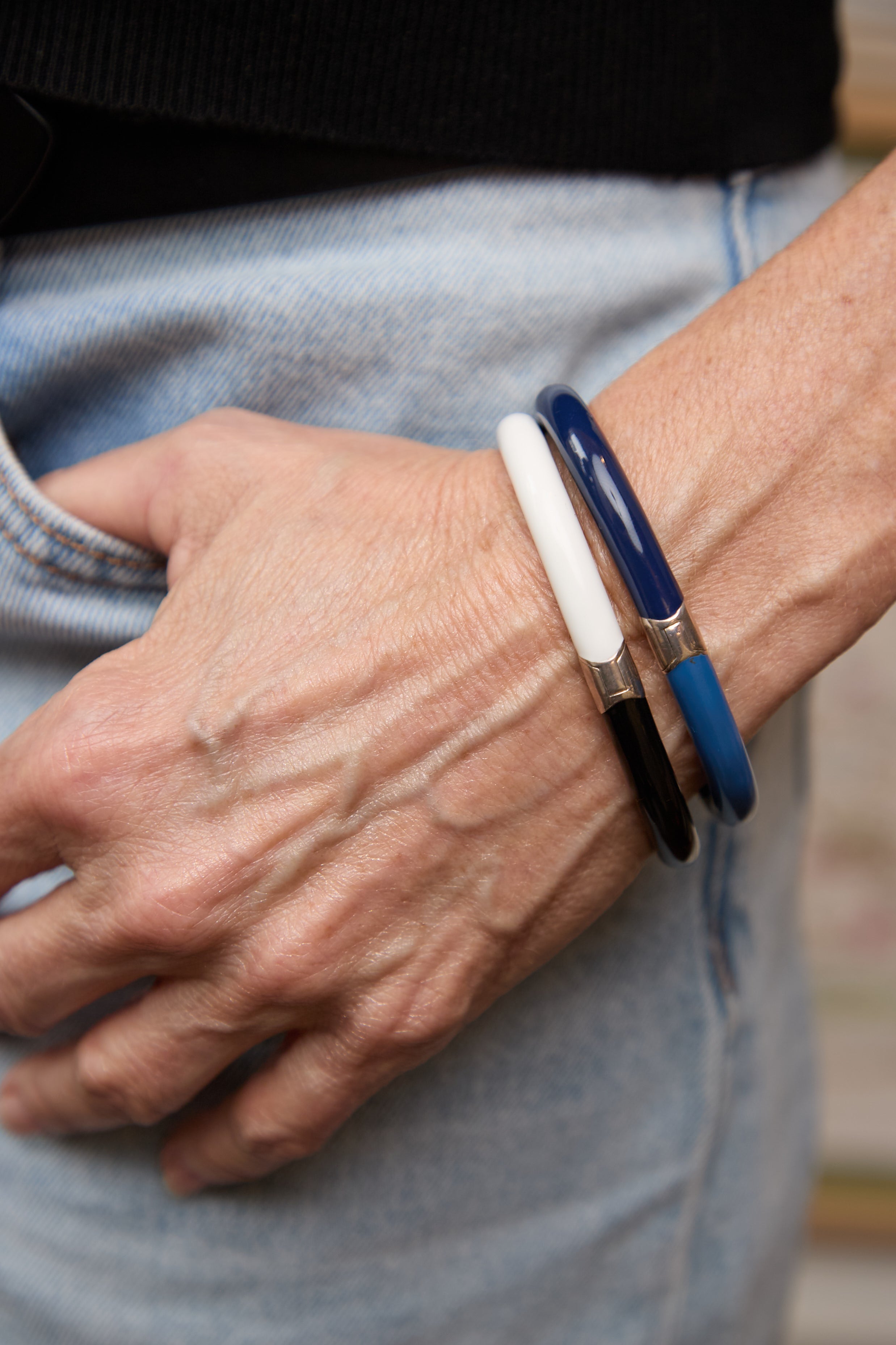 The Enamel Cuffling® Series was created when I asked myself what else do I want to stack on my wrist that I’d never seen before? The answer was bands of color. Every color. The purest expression of color. And I wanted it to feel solid and still be sterling silver–for the weight of it and because it is precious. It took over a year to finally create colors that were as vivid as the ones I imagined. We release new colors on an ongoing basis. Is there a color you dream of and you don’t see it? Email me and send me a swatch. Custom colors can take about 4 -8 weeks.