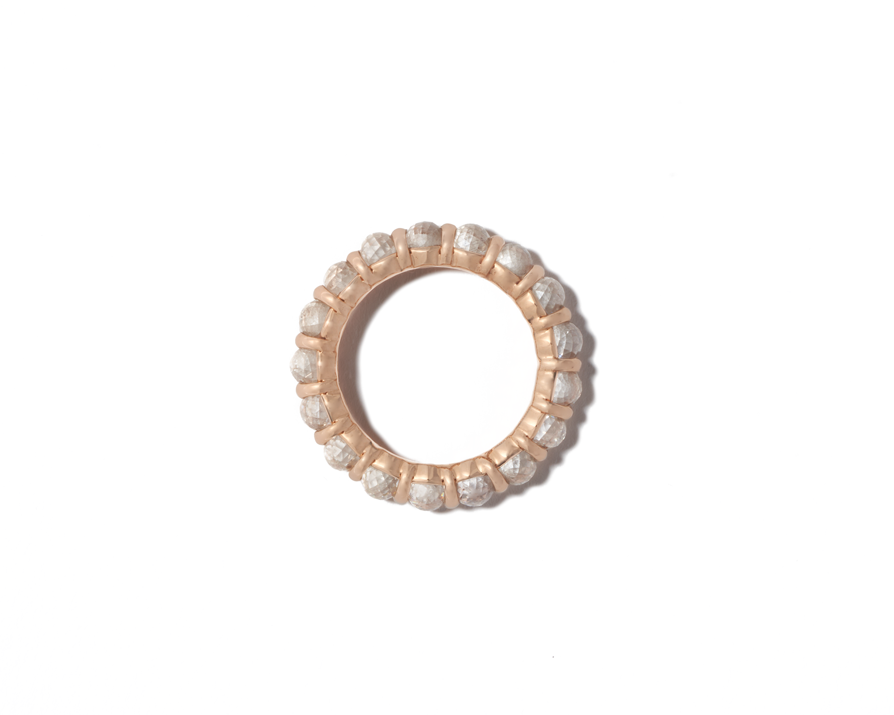 The idea for a ring with balls that roll was an afterthought of the Kissing Spheres ring from our DiMe Siempre series. We developed diamond balls for its closure, and seeing that made Marla think all that was missing was them actually moving.